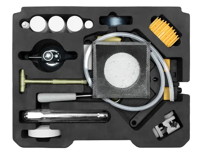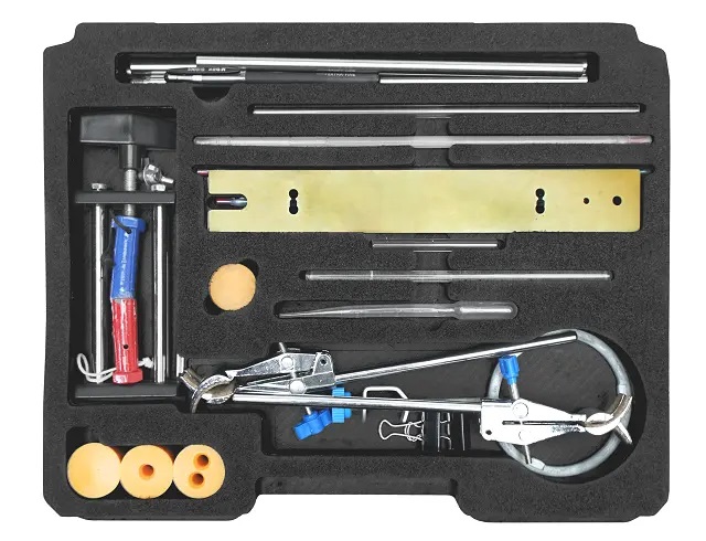 tester de dilatare și contracție termică, tester de coeziune, lampă cu microflacără cu butan, cronometru electronic, tub drept de sticlă, pahar de plastic, termometru pentru apă roșie, termometru , bloc de aluminiu, bloc de fier, bloc de cupru, parafină, tiosulfat de sodiu, clorură de sodiu, margele de sticlă anti-fierbe de laborator, bandă de hârtie, stilou cu semnătură fină, cerneală roșie , suport multifuncțional, bielă tată, biela femelă, adaptor multifuncțional, trei inele de fier, plasă de azbest, calorimetru, experimentator de conversie a energiei mecanice, cântar electronic, termometru electronic, dinamometru cu cilindru 1N, tub de sublimare cu iod, balon Erlenmeyer, cilindru de măsurare din plastic, pahar de sticlă, ventuză cu inel de tragere, foarfece și altele echipamente experimentale.