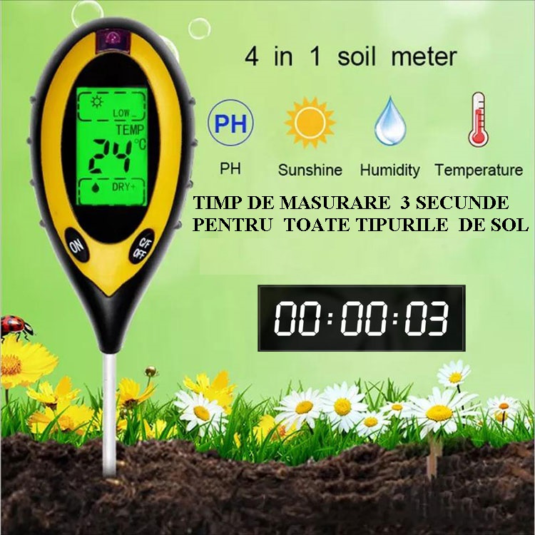Funcții: măsurarea umidității solului, a PH-ului solului, a temperaturii solului și a intensității luminii solare